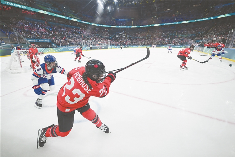 2月10日,在米兰进行的米兰-科尔蒂纳冬奥会冰球项目女子预赛A组比赛中,美国队5∶0战胜加拿大队。图为加拿大队球员艾琳·安布罗斯(中)在比赛中传球。 新华社记者 张豪夫摄