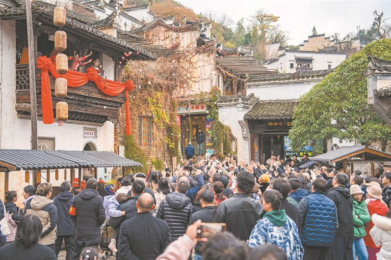 春节期间,徽剧、傩舞、抬阁、花灯、新娘茶、插香草龙等传统项目全面上新,游客可沉浸式体验、互动参与,让非遗可感可知可传承。