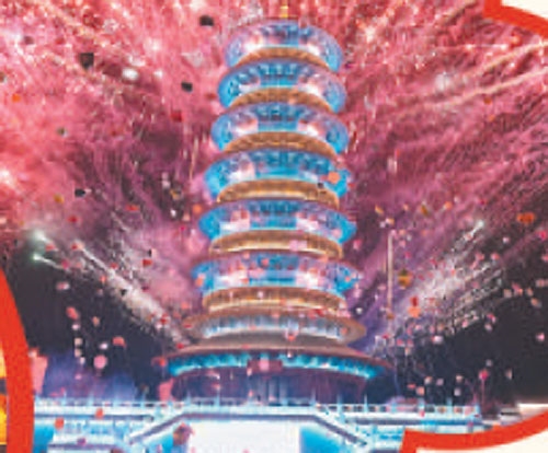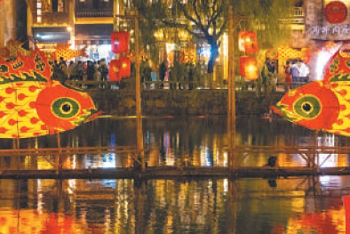 婺女洲度假区:除夕至元宵期间灯火不熄,打铁花、板龙灯、傩舞表演、抱玉塔烟花秀轮番上演,古风夜游、仙侠巡游、水上光影,一步穿越千年,一夜梦回徽州。