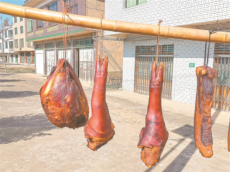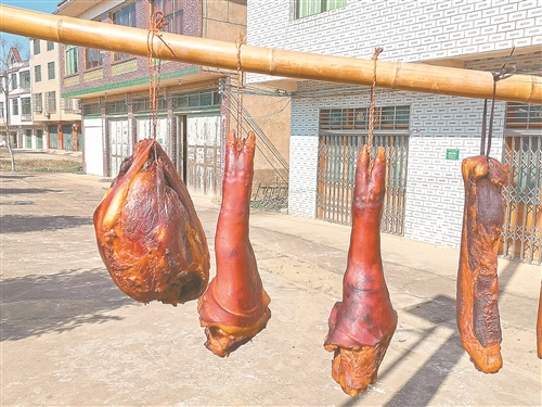 家村人都认可腊猪脚股是腊味中最好吃的。猪脚股由猪的蹄趾和腿股豚组成,它有皮有肥有精,还有筋骨关节蹄尖,猪肉的各种味道都能尝到。晒熏后,颜色乌油金亮,还会溢出缕缕火腿香。