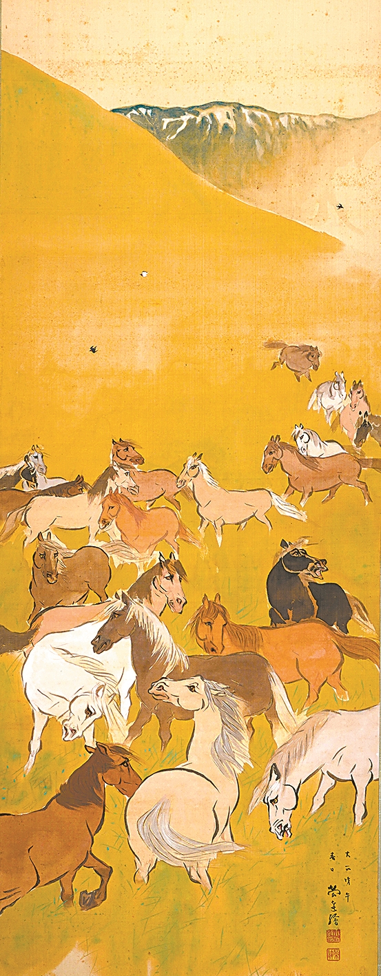 上饶美术馆所藏的《春郊牧马图》(如图),是日本画家小山荣达作于1918年的作品。此绢本设色立轴,以温润色彩描绘春郊牧马的场景:二十多匹骏马散布于草地,远山如黛,飞鸟点空,洋溢盎然生机,展现出灵动深远的意境。