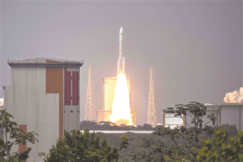 2月12日,在法属圭亚那库鲁航天中心,搭载32颗亚马逊低轨卫星的欧洲阿丽亚娜6型火箭发射升空。