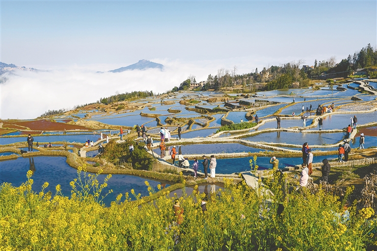 2月12日,游客在云南省元阳县新街镇爱春梯田景区游览。 新华社发 (张洪科摄)