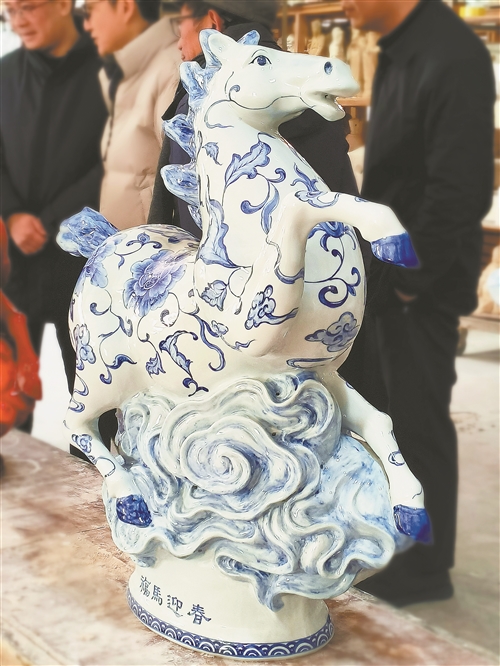 刚出窑的“福马迎春”陶瓷雕塑。本报全媒体记者 王景萍摄