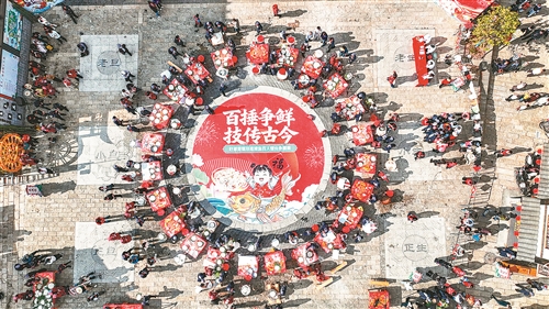 2月14日,广昌县甘竹镇旴源首镇景区内,捶鱼百人擂台赛、民俗巡游等活动热闹上演,游客沉浸式体验年味十足的民俗文化盛宴。 特约通讯员 曾恒贵摄