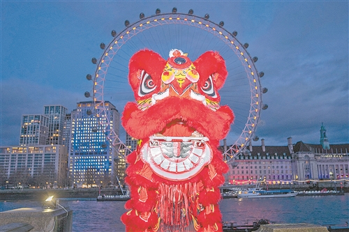 2月16日晚,在英国首都伦敦,演员在亮起红色灯光的“伦敦眼”前表演舞狮。英国伦敦地标建筑、巨型摩天轮“伦敦眼”在除夕夜亮起红色灯光,迎接中国农历新年的到来。