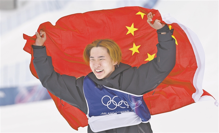 2月18日,中国选手苏翊鸣在比赛后庆祝夺冠。当地时间2月18日,在意大利利维尼奥举行的米兰-科尔蒂纳冬奥会单板滑雪男子坡面障碍技巧决赛中,中国选手苏翊鸣夺得冠军。 新华社记者 王 鹏摄