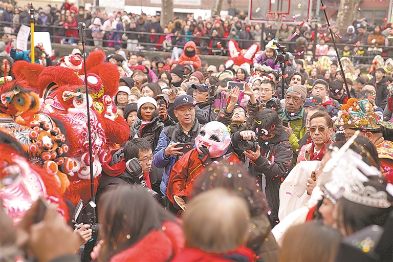 美国纽约中国城当日举行“新春炮竹文化庙会”,舞龙、舞狮、燃放炮竹等丰富的现场活动吸引数千人前来感受浓郁的中国年味。 新华社记者 张凤国摄