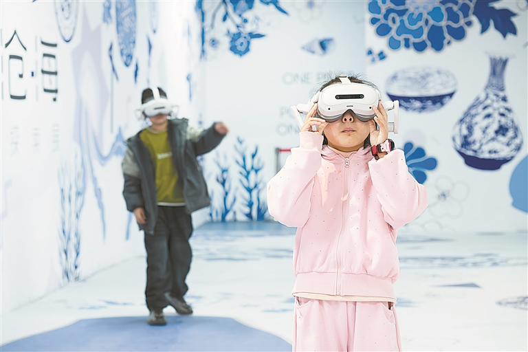 春节期间,景德镇中国陶瓷博物馆精心策划推出“一瓷一沧海”数字展,游客可佩戴VR设备,沉浸式感受海上丝绸之路的陶瓷贸易盛景。图为2月18日,游客在展览现场体验数字展。陈 文摄