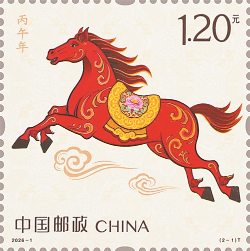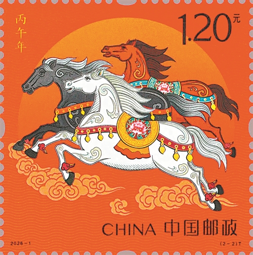 1月5日,中国邮政发行《丙午年》特种邮票一套2枚(如图),由王红卫、赵恩重联袂设计。邮票上的骏马,扬蹄奋起,呼啸前行,既展现出“一马当先”的开拓气概,也诠释了“万马奔腾”的团结力量。