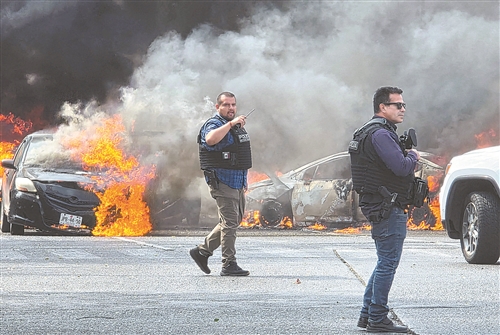 2月22日,在墨西哥哈利斯科州萨波潘,警察在被焚烧的车辆旁警戒。 新华社/路 透
