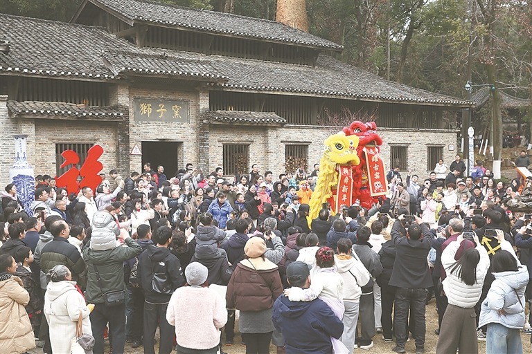 2月19日,游客走进景德镇古窑民俗博览区观看舞狮表演,沉浸式感受千年瓷都的魅力。 本报全媒体记者 张愉摄