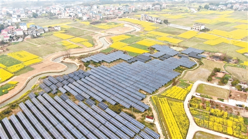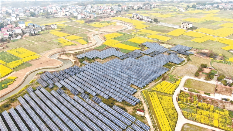近年来,遂川县大力推行 “板上发电、板下种植” 农光互补模式,将昔日荒地改造为清洁能源基地,有效带动村集体和农户增收。图为2月23日,在该县枚江镇,连片的光伏板与油菜花田、错落民居、蜿蜒河道相映成趣,宛如一幅田园诗画。通讯员 李建平摄