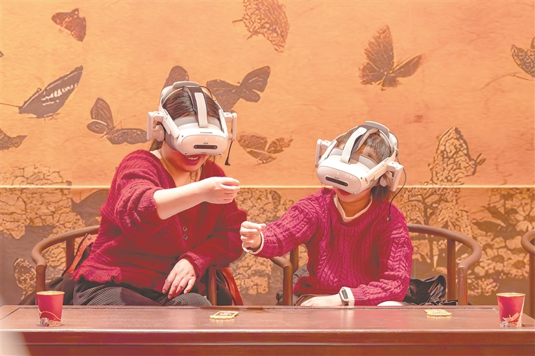 近年来,南昌市依托VR、AR等前沿技术,推出沉浸式体验展览、AI导游等服务,推动科技与文化、旅游深度融合,激发文旅消费新动能。图为2月20日,南昌市滕王阁旅游区,游客佩戴VR设备步入“时空隧道”,开启一场历史与现代的奇幻之旅。