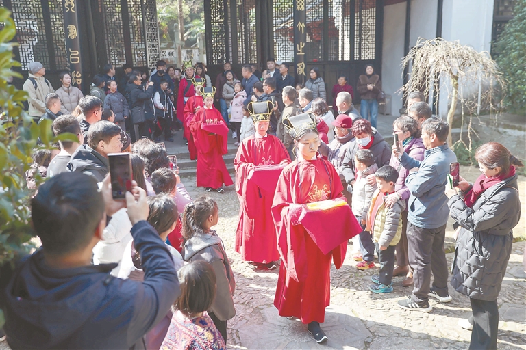 春节期间,庐山市开展“全家总动员 庐山过大年”文旅系列活动,通过民俗年货市集、庙会、快闪秀、游园会等,促进文旅市场持续火爆。图为2月21日,庐山市白鹿洞书院丰富多彩的文旅活动吸引各地游客前来游玩。