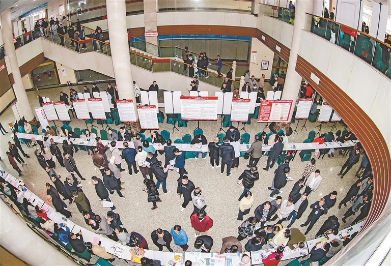 春节期间,新余市举办促就业留人才专项行动暨春风行动春季大型人才交流会,参会的202家企业提供岗位3495个,覆盖制造、金融、信息技术等多领域。图为2月23日,求职者在人才交流会上了解就业信息。 特约通讯员 赵春亮摄
