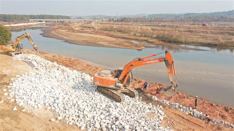 2月24日,永丰县佐龙乡麻江水环境治理现场,工人正在进行河岸生态修复。通讯员 刘浩军摄