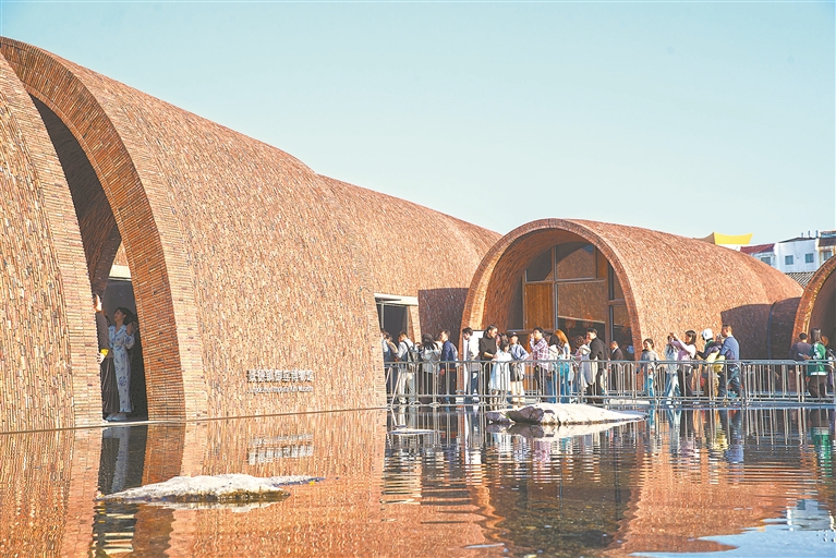 | 2月21日,在景德镇御窑博物馆前,拱形建筑与水面倒影相映成趣,打卡拍照的游客络绎不绝。本报全媒体记者 吴福清摄 |