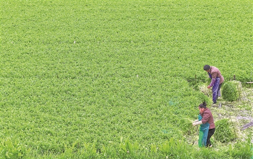 | 2月19日,在乐平市后港镇大田村,村民采收水芹准备抢“鲜”上市。本报全媒体记者 徐 铮摄 |