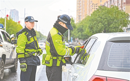 | 2月19日,分宜县公安局交通管理大队的交警在重点路段执勤,全力守护群众平安出行。本报全媒体记者 张翰林摄 |