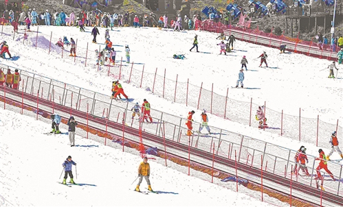 | 2月18日,游客在铜鼓县排埠镇七星岭国际滑雪场体验滑雪的乐趣,欢度春节假期。 特约通讯员 周 亮摄 |
