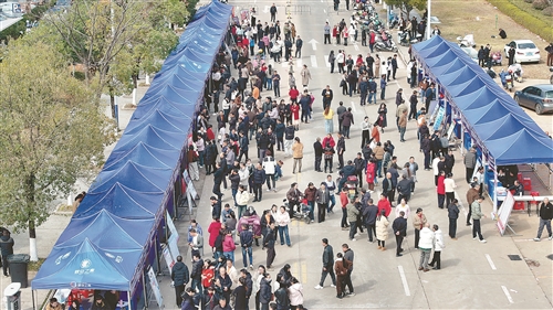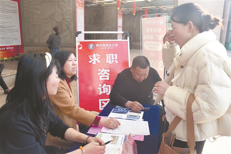 春节期间,南丰县利用外出务工人员集中返乡时机,搭建供需对接平台,助力返乡农民工在家门口就业。图为2月22日,南丰县“春风行动”就业援助大型招聘活动在橘都文化广场举行。