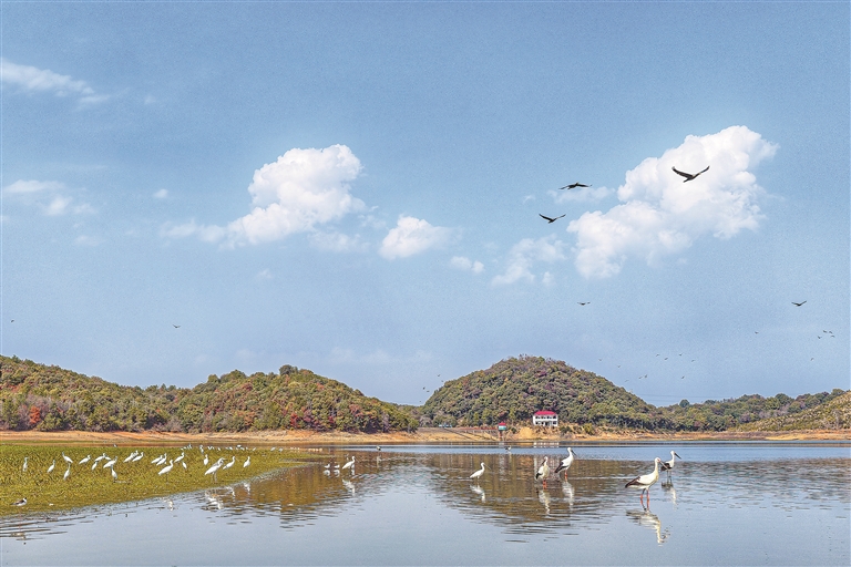 近日,乐平市镇桥镇与礼林镇交界的栽禾峰水库迎来“贵客”,成百上千只“鸟中国宝”东方白鹳或悠然涉水觅食,或凌空翩跹,白琵鹭、反嘴鹬等也在此结伴栖息。本报全媒体记者 徐铮摄