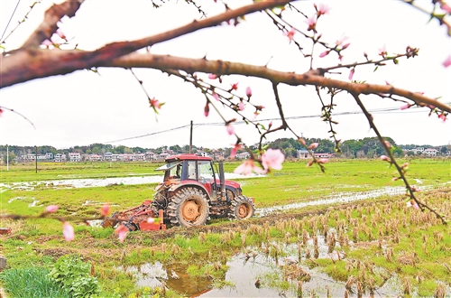 2月27日,在万载县潭埠镇濠田村,农机手驾驶农机在稻田里来回穿梭,翻耕、平整土地,抢抓农时备战春耕。