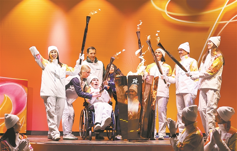 当地时间3月3日,米兰-科尔蒂纳冬残奥会火种汇集仪式在意大利科尔蒂纳举行,火炬手共同点燃火种台。 新华社记者 王楷焱摄