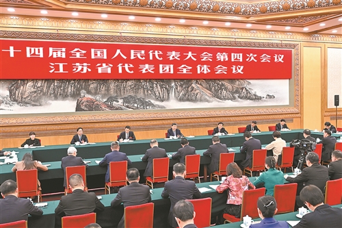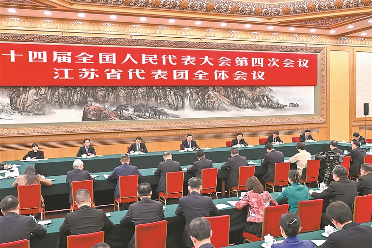 3月5日下午,中共中央总书记、国家主席、中央军委主席习近平参加他所在的十四届全国人大四次会议江苏代表团审议。 新华社记者 殷博古摄