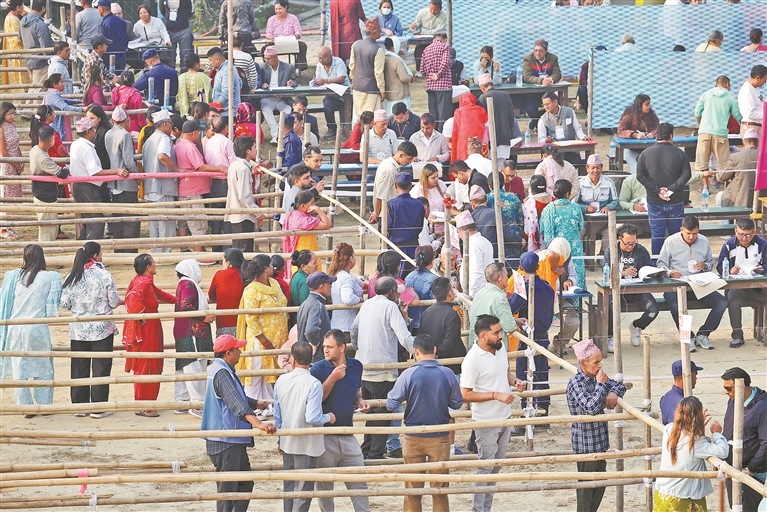 3月5日,人们在尼泊尔达马克的一处投票站排队等候参加投票。尼泊尔联邦议会众议院选举投票3月5日7时(北京时间5日9时15分)开始。众议院拥有275个席位,其中165个席位将通过简单多数制产生,其余席位将通过比例代表制分配。新华社/路透