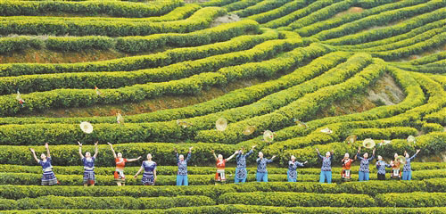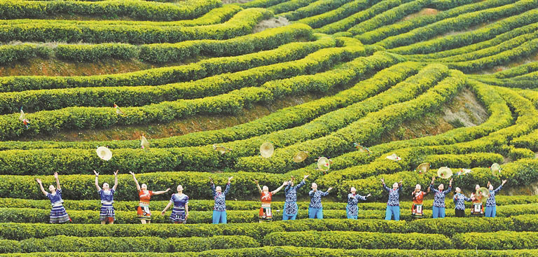 随着气温回升,鄱阳县游城乡小富茶园迎来春茶采摘期,成为游客踏青赏春、打卡留影目的地。图为3月7日,游客装扮成采茶女在茶园游玩。 陈若薇摄