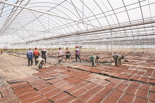 3月10日,新余市渝水区姚圩镇新宋村,村民在大棚内摆放秧盘。当前正值春耕备耕时节,新余市各地正紧锣密鼓开展早稻育秧等工作,为春耕春播作好准备。 通讯员 谭建荣摄