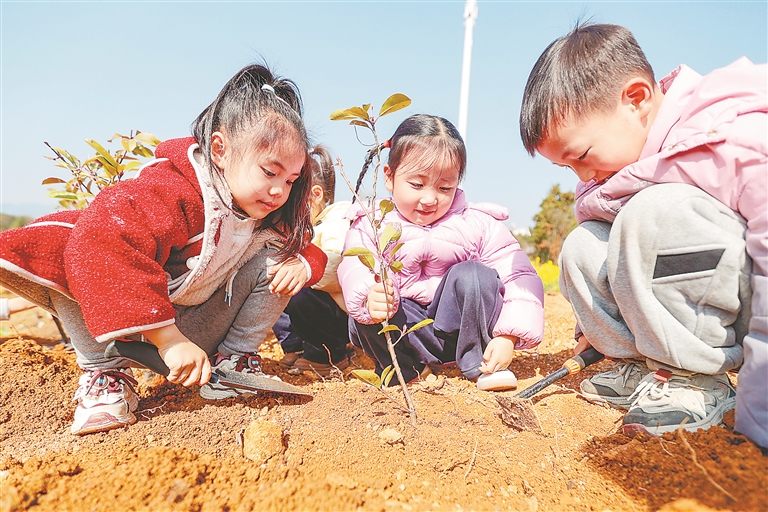 3月11日,峡江县城西幼儿园组织小朋友开展植树活动,为大地增添新绿。特约通讯员 陈福平摄