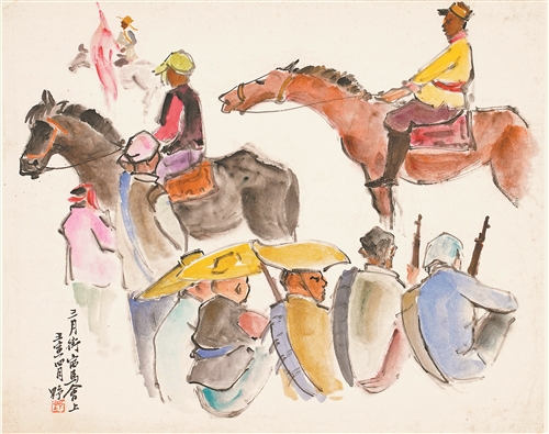 新中国成立后,万象更新,“文艺为人民服务、为社会主义服务”,要求画家深入生活、扎根基层,用艺术记录时代变迁与民族风貌。传统中国画面临新的时代语境。1962年4月,林野于云南大理完成的写生作品《三月街赛马会上》(如图),正是这一时代语境的印证。此作现藏于上饶美术馆。