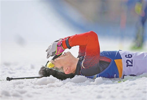 3月13日,中国选手余爽在夺冠后。当地时间3月13日,在意大利泰塞罗举行的冬残奥会冬季两项男子短距离追逐(视障)比赛中,中国选手余爽夺得冠军。