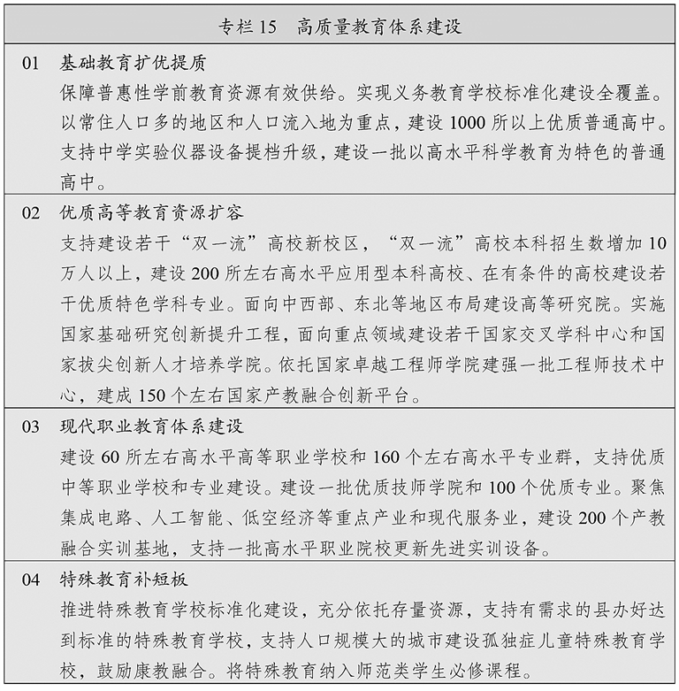 推进现代职业教育体系建设,提高职业教育办学质量和吸引力。优化与区域发展相协调、与产业布局相衔接的职业教育布局,推动专业设置紧密对接产业链创新链需求。深化中等职业教育改革,办好少而精的中等职业学校,建设特色鲜明高等职业学校,支持中高职一体化发展。建设一批高水平本科层次职业学校,推动职业教育本科与专业学位教育融合贯通。实行产教融合的人才培养模式,健全德技并修、工学结合育人机制,鼓励行业龙头企业举办或参与举办职业学校。
