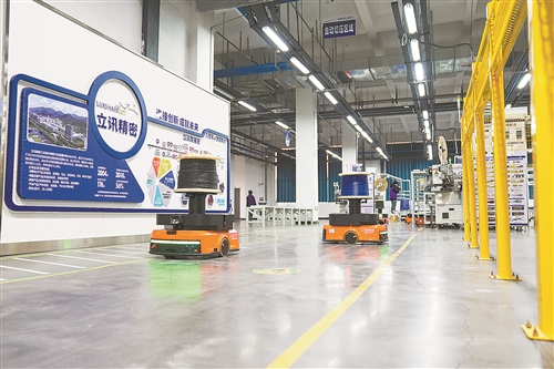 协讯电子生产车间,产线满负荷运转,自动导向车载着物料灵活穿梭,工人有条不紊地进行汽车线束产品组装。“去年,我们投入近千万元进行产线数字化升级,生产效率直接提升10%。”公司相关负责人程松强介绍,经过十余年发展,企业产品不断丰富,去年营收达8亿元,成为当地电子信息产业的黑马。
