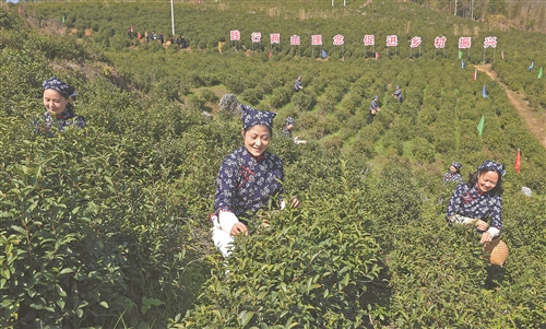 随着天气转暖,铅山县河红茶长势喜人。该县河红茶种植面积11.4万亩,年产量4520吨,综合产值24亿元,带动4.8万人从业,人均年增收2.5万元。图为3月13日,铅山县葛仙山镇朱村村千亩生态示范茶园内,茶农正在采摘春茶。 本报全媒体记者 刘宇琦摄