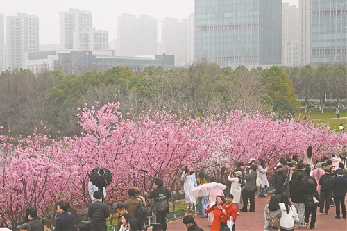 南昌高新区艾溪湖迎来盛花期。图为3月14日,市民在艾溪湖森林湿地公园赏樱花。本报全媒体记者 蔡铖歌摄