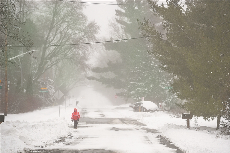 3月15日,在美国明尼苏达州明尼阿波利斯,行人走在被大雪覆盖的道路上。一场强劲风暴15日席卷美国大部分地区,导致数千个航班被取消,部分地区断电。据估计,近2亿美国民众受到此次风暴影响,其中超过1100万人处于暴雪预警之下。 新华社/美联