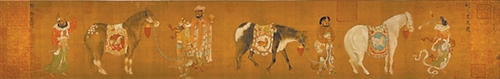 盛唐之际,画马之风极盛,韩干笔下的《胡人呈马图》(如图)便是生动例证。此作现藏于美国弗利尔美术馆,传为明清摹本,高28.1厘米,长156.3厘米,以绢本笔墨定格马的雄健,让我们得以窥见盛唐长安的民族交往盛景。