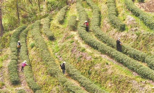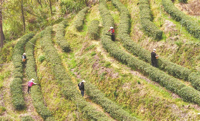 3月18日,大余县黄龙镇大龙村丫山生态茶园,村民在采摘明前茶。特约通讯员 叶功富摄
