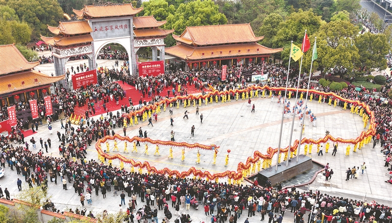 3月20日,农历二月初二,俗称“龙抬头”。赣州市章贡区沙河镇五龙客家风情园内,舞龙者操控百余米长的金色巨龙灵动游弋,市民驻足观赏,现场气氛热烈。通讯员 廖培宇摄