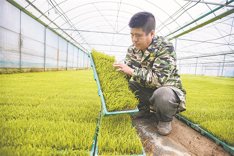 3月18日,德兴市大茅山镇智能育秧中心绿意盎然,种粮大户正在查看早稻秧苗长势。当地引导种粮大户引进智能设备与先进技术,水稻从浸种、催芽、育苗到移栽实现全程智能化。本报全媒体记者 徐 铮摄