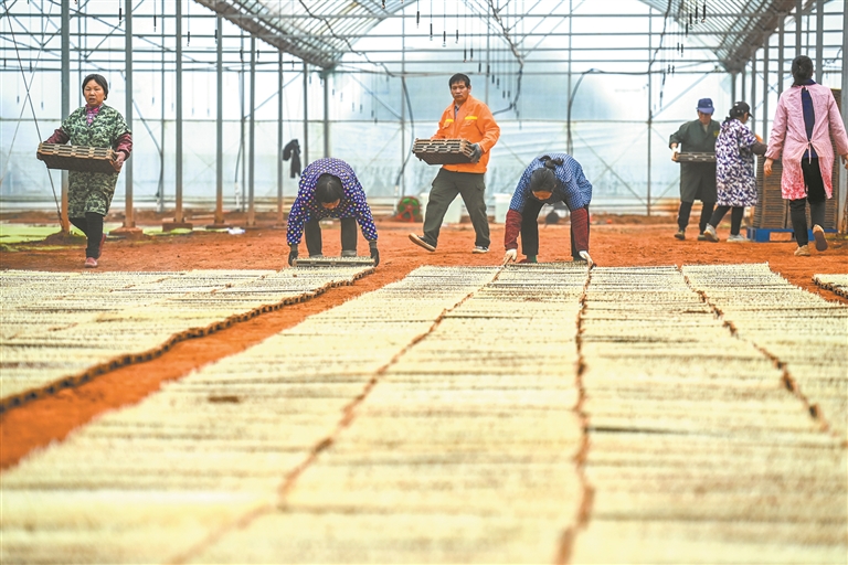 3月20日,樟树市义成镇刘家村村民在标准化育秧中心搬运育秧盘。春分时节,当地农民抢抓农时,运用智能育秧播种流水线、智慧大棚等,进行早稻集中工厂化育秧作业。特约通讯员 周 亮摄