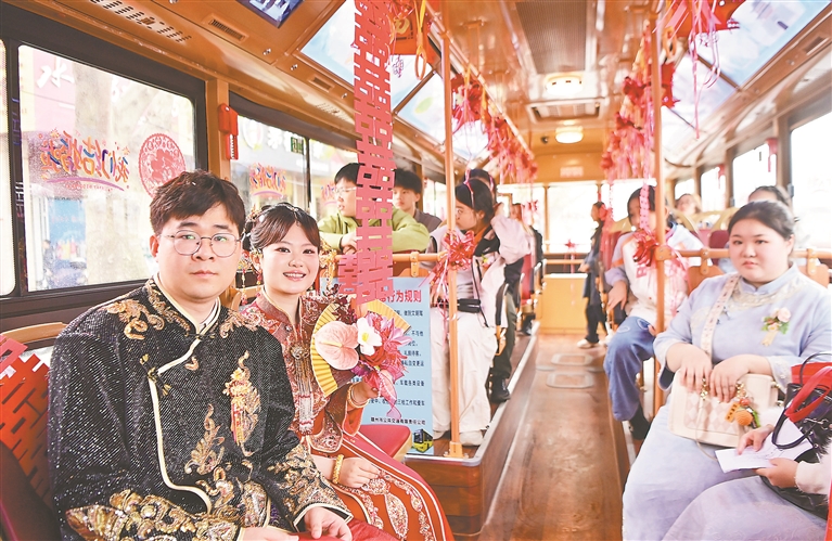 近年来,赣州市章贡区深化婚俗改革,推出“520”“1314”浪漫公交专线,引导年轻人积极践行移风易俗,弘扬文明新风。图为3月22日,该区一对新婚夫妇租用新能源公交车作为婚车,邀请亲朋好友共同见证幸福时刻。特约通讯员 胡江涛摄