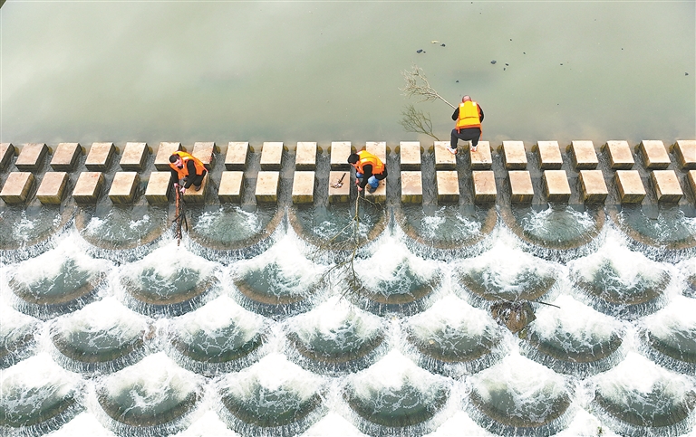 近年来,万载县推行“党建+河长制+志愿者”护河模式,常态化开展河道巡查、保洁等志愿服务活动。图为3月21日,志愿者在该县康乐街道龙河段清理河面漂浮物。 特约通讯员 邓龙华摄
