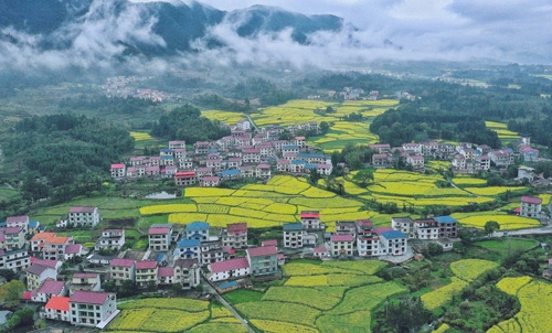 近年来,莲花县立足生态优势,推广“油稻轮作”模式,以花为媒,打造赏花节会,丰富文旅业态。图为3月21日,该县高洲乡2万余亩油菜花层层叠叠竞相绽放,与云雾缭绕的青黛山影、静静伫立的农宅村落一起,勾勒出一幅秀美田园画卷。