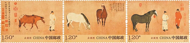 古往今来,以马为主题的绘画佳作不少。中国邮政于3月3日发行的一套3枚《出圉图》特种邮票(如图),图案取自元代画马名家任仁发创作的绢本设色长卷《出圉图》。